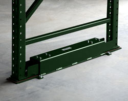 The Seismic Base Isolation System from RIDG-U-RAK reduces the effects of seismic acceleration ground forces on the rack structure. The Base Isolation unit is positioned between the columns of the upright frames and anchored to the floor using standard installation procedures. This allows the rack’s upright frames to “travel” during a seismic event.